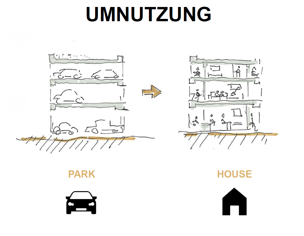Das gesamte Gebäude ist in Holzbauweise konzipiert und berücksichtigt eine zukünftige Zweitnutzung. Die Parkgeschosse werden über ein klassisches Split Level erschlossen. Der innenliegende Patio ist das Herzstück des Parkhauses und bildet ein begrünter Innenhof. Sowohl die Tragwerksstruktur wie auch die Gebäudekubatur ermöglichen eine Umnutzung der Parkgeschosse in attraktiven Wohnraum. Hier können vielseitige Wohnformen mit einem Mix von Ein- bis Vier-Zimmer-Appartements entstehen, die sich um den Gemeinschaftshof ausrichten. Die offene Holzfassade des Parkhauses kann für die Zweitnutzung beibehalten werden und bildet mithilfe der begrünten Fassadenelemente die notwendige Privatsphäre und Schutz in den Loggien.