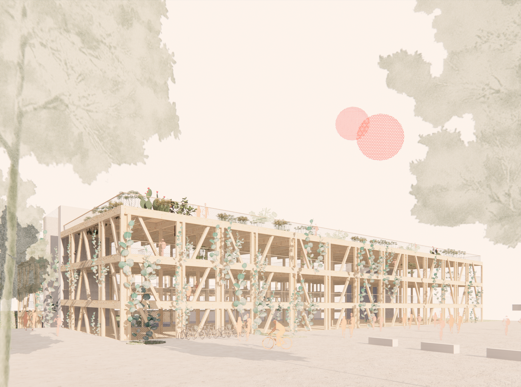 Das Holzparkhaus steht für eine zukunftsweisende und nachhaltige Architektur. Das Bauen in nachwachsenden Rohstoffen wie auch die Planung von nutzungsoffenen Gebäudestrukturen, welche sich flexibel auf die zukünftigen Bedarfe der Stadt anpassen lässt, sind wichtige Lösungsansätze für die aktuellen Herausforderungen der Klimawende. Die Durchführbarkeitsstudie untersucht die Möglichkeiten der Holzbauweise hinsichtlich Ressourceneinsatz, Umweltbelastung und Möglichkeiten der Bauordnung in Hinsicht auf Bauen mit biobasierten Materialien.