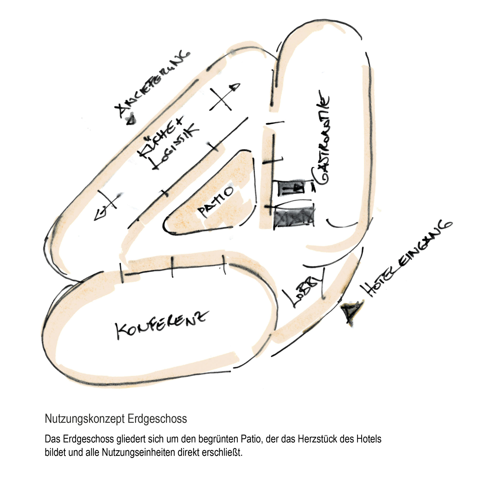 Zwei Gebäudeschenkel mit 5 und 6 Geschossen, in denen die 149 Hotelzimmer untergebracht werden, sind harmonisch ineinander verwoben. Das Sockelgeschoss übernimmt
