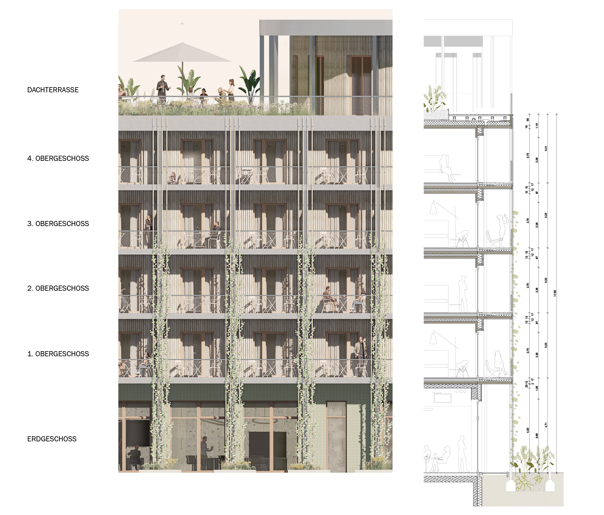 Zur Sicherstellung der ökologischen, aber auch der ökonomischen Anforderungen an das Projekt wurde eine Holzmodulbauweise gewählt, die eine zukunfts- und umweltgerechte Bauweise mit nachwachsenden natürlichen Baustoffen darstellt. Filigrane, hölzerne Rankelemente, sowie die Gestaltung der Dächer als fünfte Fassade komplettieren die nachhaltige Ausrichtung des Entwurfs.
