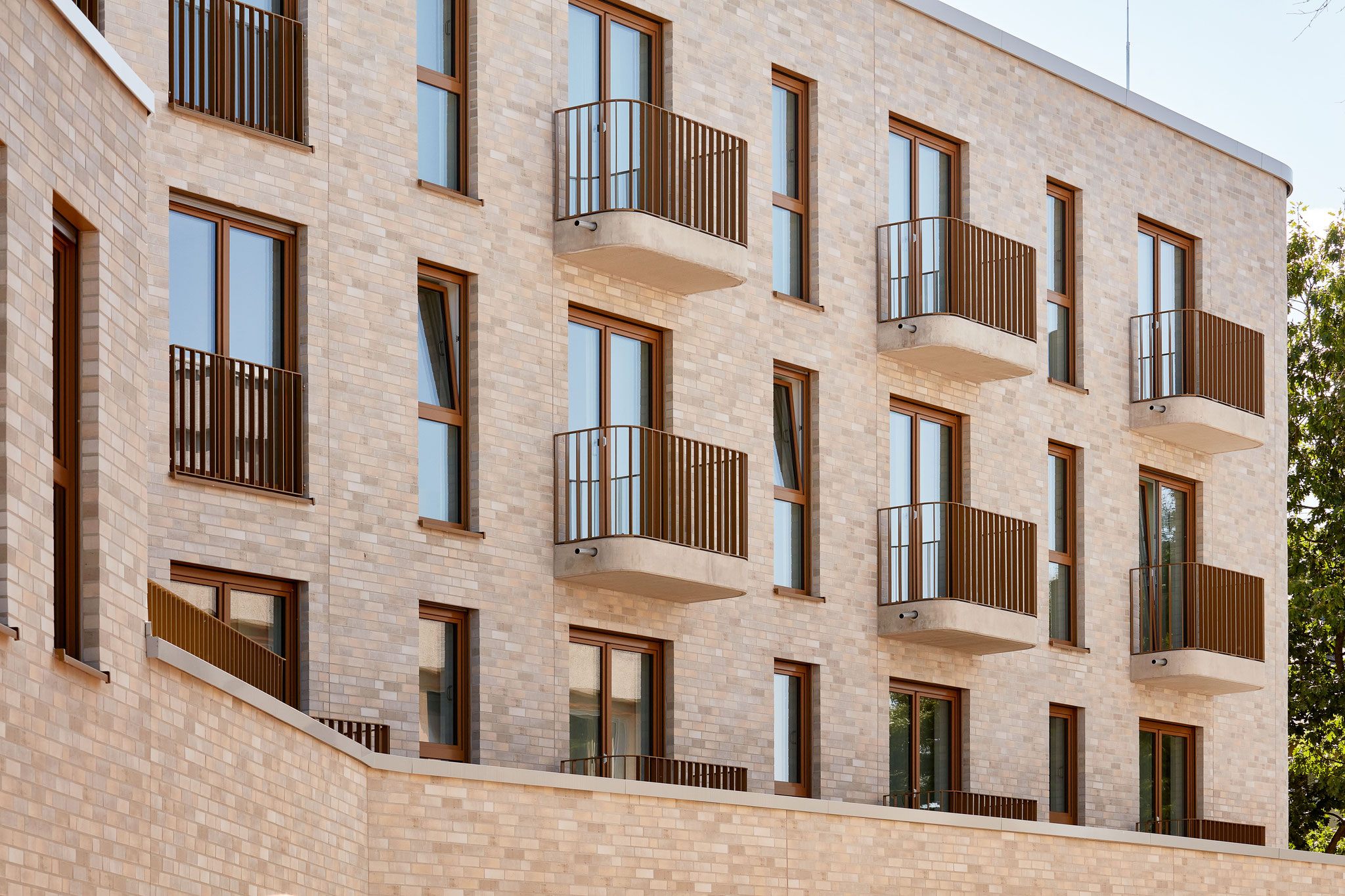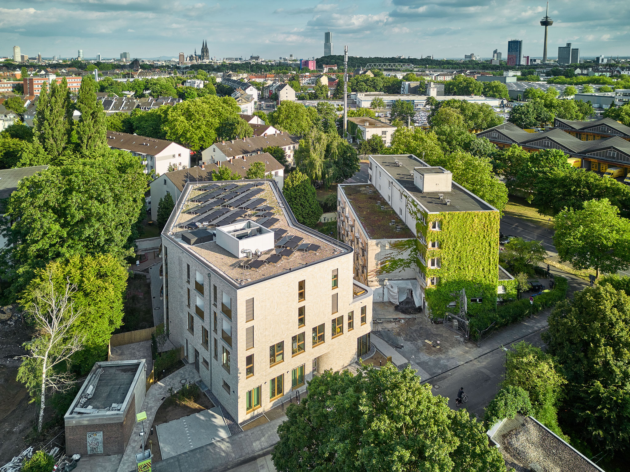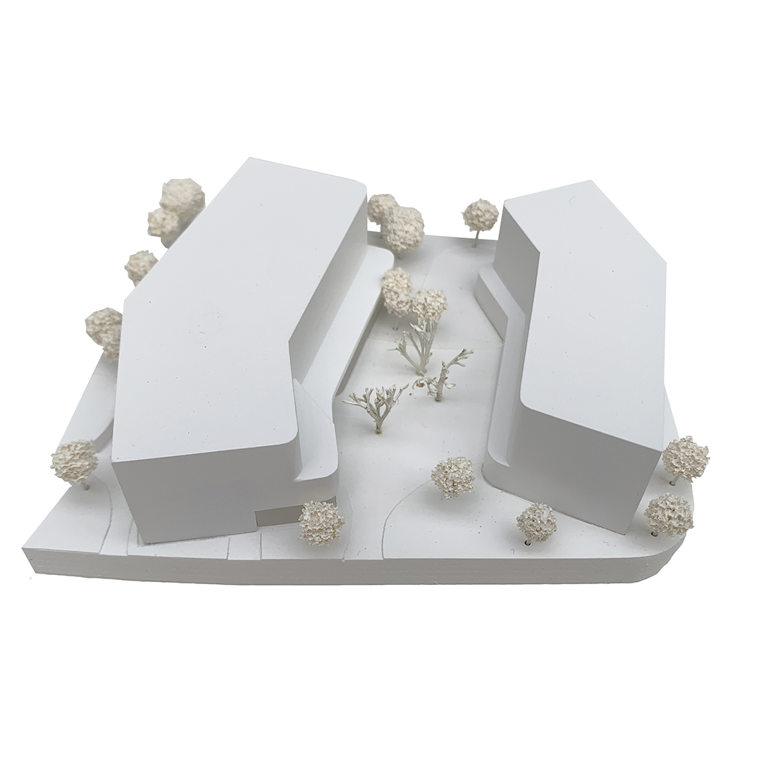 Der „ORT DER MITTE“, umgeben von den leicht angewinkelten Baukörpern, bildet eine einladende und dennoch geschützte Aufenthaltsfläche. Die zueinander eingeknickten Baukörper umarmen die Gemeinschaftsfläche wie zwei schützende Hände. Die Ecksituation wird städtebaulich klar gefasst und bildet gleichzeitig eine einladende Geste.